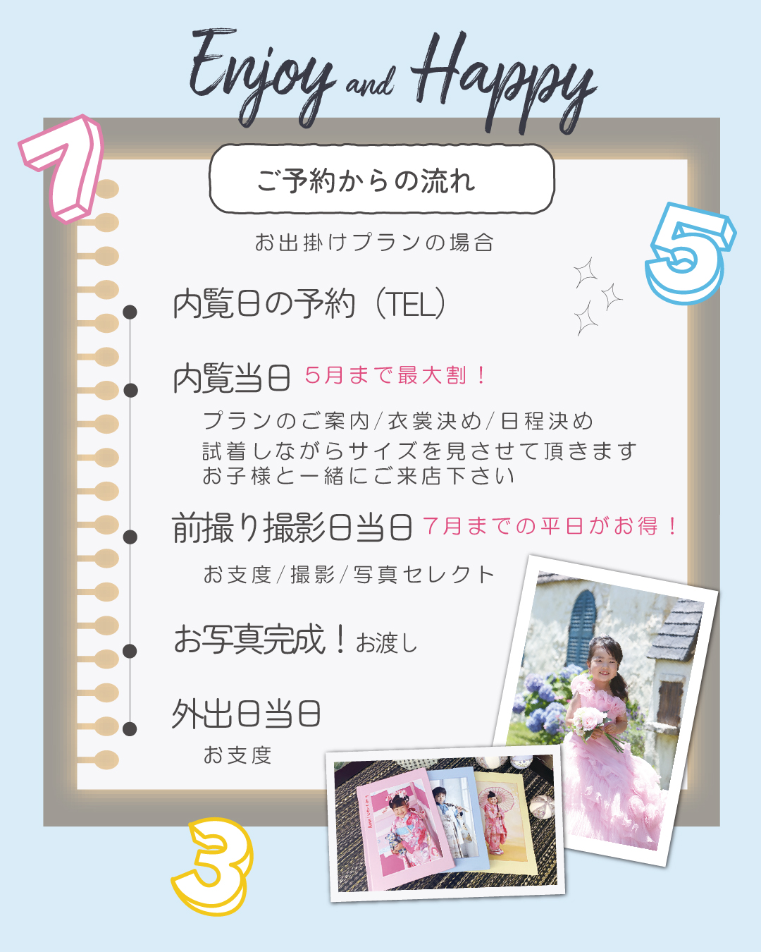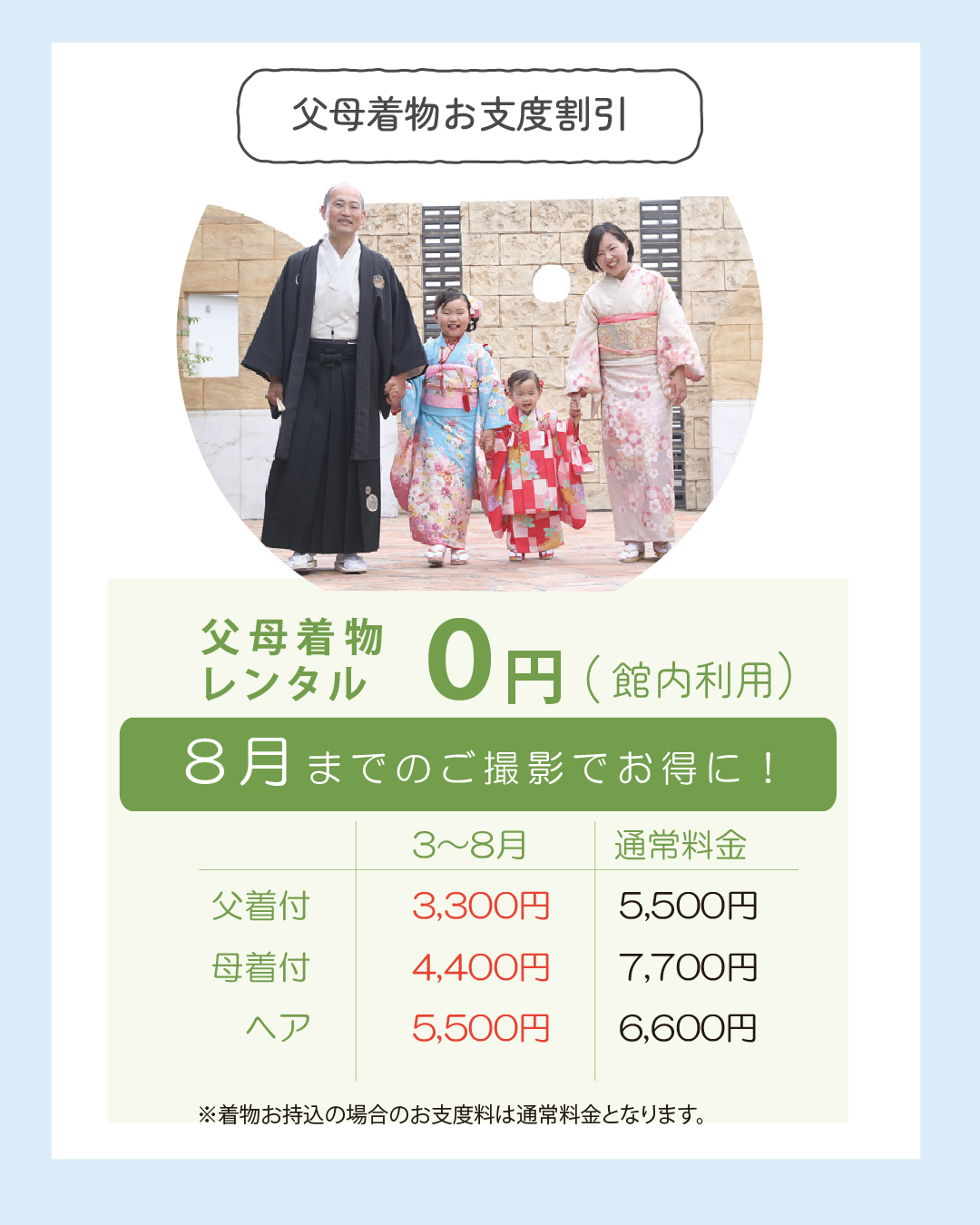 ※3 お着付代は別途頂戴いたします。7月末までに撮影すると割引となります。詳しくは↓へ